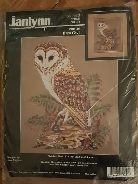 Barn Owl Counted Cross Stitch Kit, finished size 13"x16" This is a BIG kit and contains 14 count cotton Aida, pre-sorted 6 strand cotton floss, needle, graph and instructions.